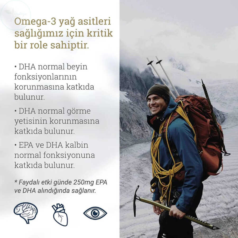 Günlük 540 mg EPA, 390 mg DHA ve 120 mg DPA ile toplamda 1050 mg Omega-3 desteği