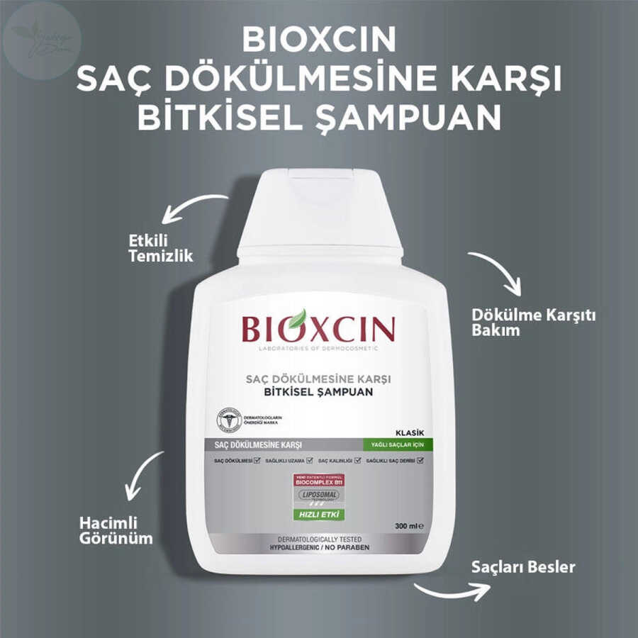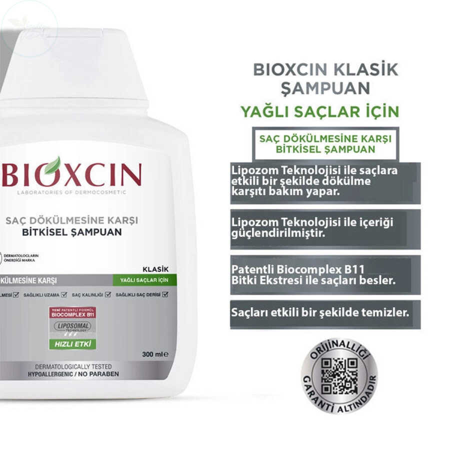 Bioxcin Klasik Şampuan, özel formülünde yer alan patentli Biocomplex B11, zeytin yaprağı ekstresi, incir yaprağı ekstresi, bal ve mentol sayesinde saç dökülmesini engellemeye yardımcı olur ve saç sağlığını destekler. Niasinamid içerdiği için aşırı yağlanmayı dengelemeye yardımcı olur. Ayrıca, saçı besler, hacim kazandırır ve parlaklık verir.